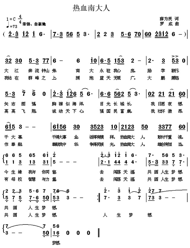 《热血南大人》作为向母校115周年华诞的献礼歌曲,由薛为民校友作词,著名国家一级作曲家、音乐理论家罗成配曲,歌词主要是从已走出校门和未走出校门即将走出校门的学子角度而写,立意高远、气势磅礴、热血飞扬,同时又兼具细腻动人之情...