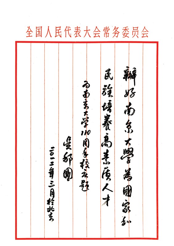 中共中央政治局常委、全国人大常委会委员长吴邦国题词