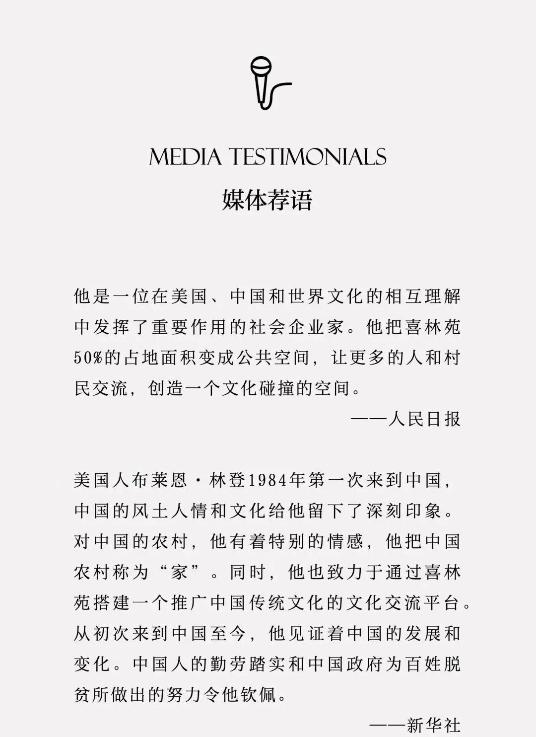 他是一位在美国、中国和世界文化的相互理解中发挥了重要作用的社会企业家。他把喜林苑50%的占地面积变成公共空间,让更多的人和村民交流,创造一个文化碰撞的空间。酒店每周都为村民和住客开设免费英语课程,这是喜林苑一直坚持的理念。来自不同领域的精英在成为喜林苑酒店的住客时,也有可能会受邀为当地人举行讲座或者行业分享,“不仅是我们从这个村子获得东西,不止我们会给到村里人东西,来到喜林苑的客人也会给到大家东西。”
