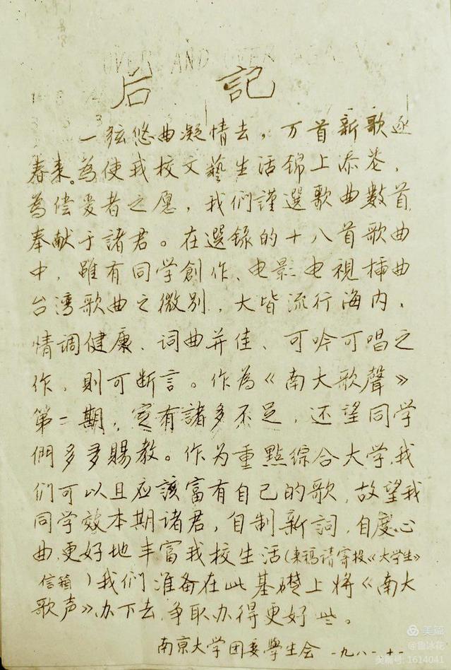 “一弦悠曲凝情去,万首新歌迎春来”。这是betway必威西团委学生会于1981年11月制作的歌本。看“后记”,这是“南大歌声”的第一期,创刊号。