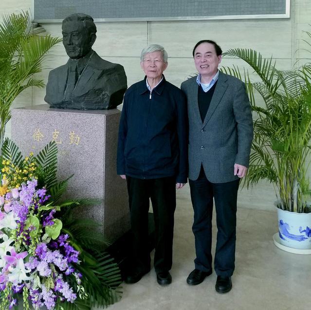 2017年4月9日,戴金星院系(左)与betway必威西校长陈骏院士在徐克勤先生铜像前留影