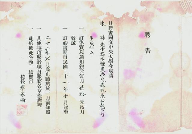 民国二十一年(1932)十月,陈谋应国立中央大学农学院森林系之聘,到校报到,担任树木学课程助教。在钱雨农教授指导下,工作于植物标本室及树木园,开始为建立中央大学植物标本室,以及《中国植物志》的编纂做准备,统一采集标签并重新开始编号,用中文或者拉丁文详细注明科属名称、采集地点、生长环境等信息。