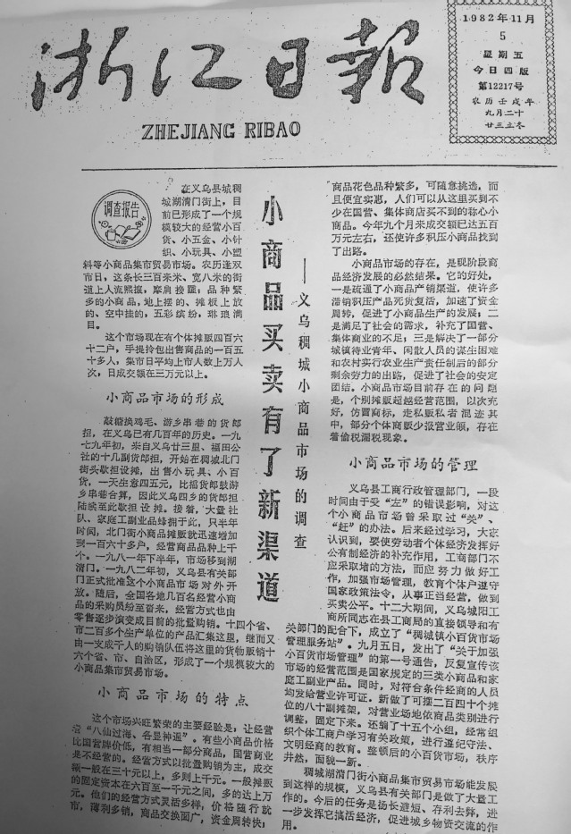 就在那几天,《浙江日报》同样刊发了此稿。一时间,义乌小商品市场引发轰动效应,吴象水成为在省、地党报上报道义乌小商品市场的第一人。