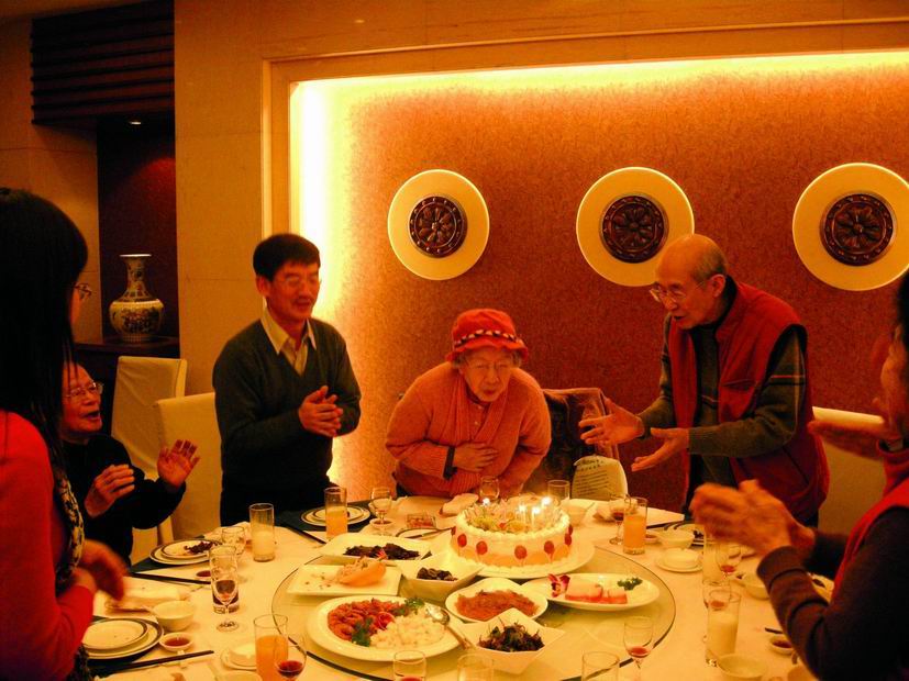 中午时分即在该酒店聚餐。主持人突然宣布:现在为王镇圭老学长祝贺90寿辰。服务员即时送来一只大的生日蛋糕、九支生日蜡烛和一大碗寿面,令王老和全体与会者深感意外,场面骤时热闹了起来,全体校友共唱“生日快乐”歌曲,祝王老健康长寿,聚会活动达到了高潮。原来这是聚会赞助者杨柳军理事为此临时作出的安排,让王老感慨万千,终身难忘。