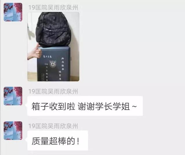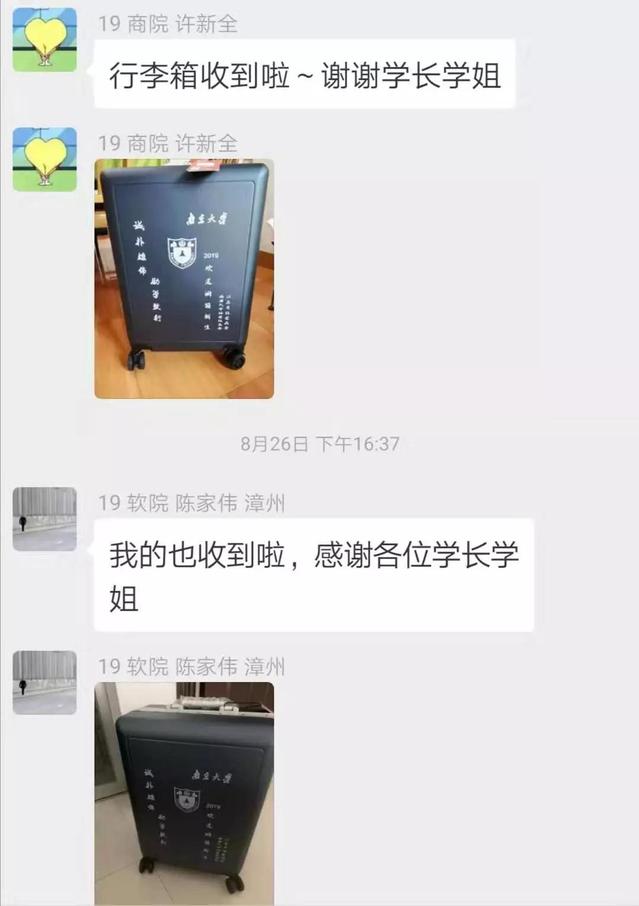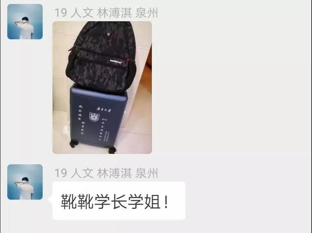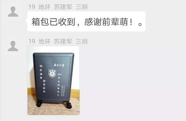 校友会选取福建祥兴集团生产的拉杆箱作为新生入学礼物,祥兴集团董事长薛行远先生特意为每个新生赠送双肩包,以壮行色。福建校友会精心设计排版,在旅行箱上统一印制了母校校训、校徽,这带有母校特色元素的旅行箱成为了新生踏上南京求学路时彼此相认的标识。