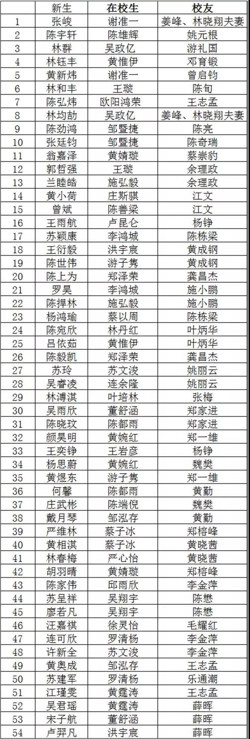 参与本次活动的新生:张峻、陈宇轩、林群、林钰丰、黄新炜、林和丰、陈弘炜、林均劼、陈劲鸿、张廷钧、翁嘉泽、郭哲强、兰睦皓、黄小荷、曾斌、王雨航、苏颖康、王衍毅、陈世伟、陈上为、罗昊、陈捍林、杨鸿瑜、陈宛欣、吕依茹、陈毅凯、苏玲、吴睿凌、林溥淇、吴雨欣、陈晓玟、颜昊明、王奕铮、杨思蔚、黄煜东、何馨、庄武彬、戴月琴、严维林、黄相淇、林春梅、胡羽晴、陈家伟、苏呈祥、廖若凡、汪嘉祺、连可欣、许新全、黄奥成、苏建军、江瑾雯、吴君瑶、宋子航、卢羿凡
