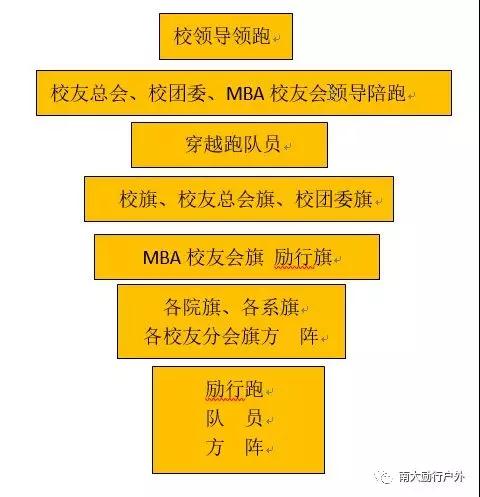 (2)校领导领跑,校友总会领导、校团委领导、商学院领导协跑,参加活动由商学院等院系、MBA校友会等校友分会分别高举各院系及各校友会旗帜组成方阵。