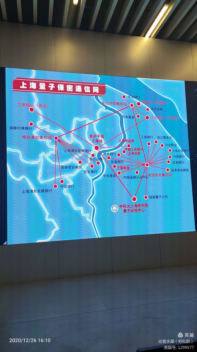 特地问了可不可以拍照。回答说可以。在不少大城市都已经建立了这样的量子通讯保密网,量子科学事实上已经走进了我们的生活,只是我们看不见摸不着。