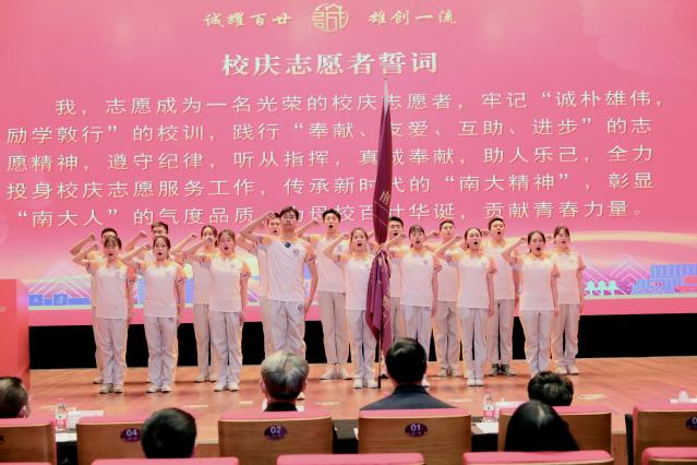 胡金波向校庆志愿者学生代表授旗。学生志愿者代表们现场进行了志愿服务宣誓。