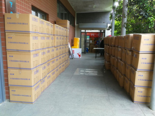 图为孙国香校友捐赠给学校的15万只一次性防护口罩