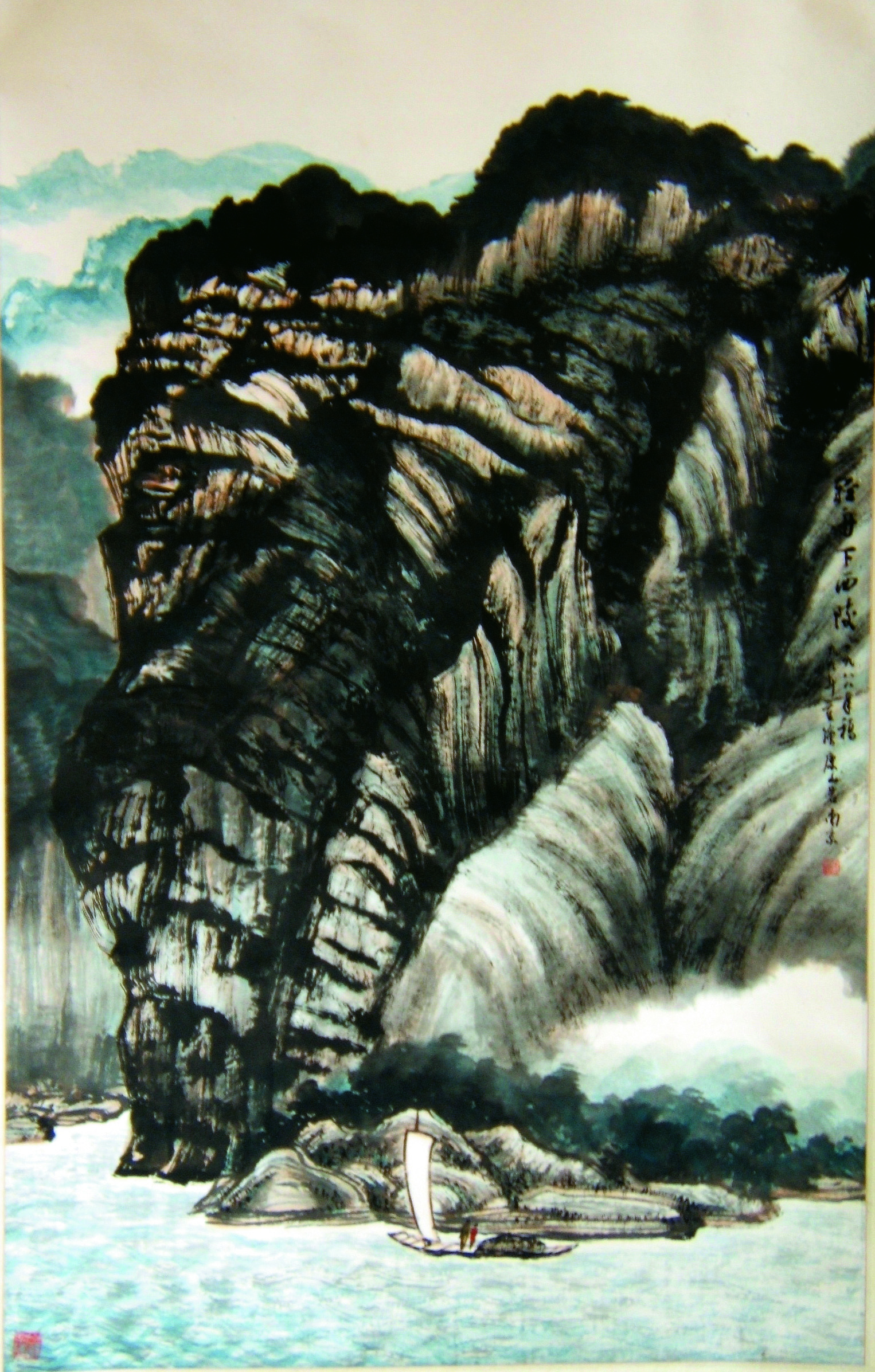 因缘际会,1965年秋我病后休养期间的拜师学画,使我增加了另外一份本事,让我可以用山水艺术去参与地质科学研究。1981年11月下旬我乘船去重庆,到成都参加全国微体古生物学会学术年会。我乘坐的“江峡号”轮船翻过葛洲坝进入长江三峡,在船长支持下,我独自一个在船舱顶棚看三峡,我运用当年郭令智老师教我的地表形态反映岩石性质和地质构造的方法,观察长江三峡两岸风光的地质地貌特征,分析长江三峡的形成机理。沿途观察,让我认识到长江三峡是由北东向和北西向两组共轭断裂系统作锯齿状的拉张形成的峡谷地形。我曾写一首长江三峡诗:两组断裂追踪张,高耸峡壁森森然,山重水复疑无路,船到壁前直转弯。成都会议结束回到南京,经过三个月的构思,1982年3月我创作出了《夔门》,这是我第一次运用地质科学知识,去观察、分析、表现瞿塘峡断裂构造特征的山水画,是我的地质山水画开篇之作。画面左面的低短孤山是白帝城,由白帝城到画面中心山体逐次升高,画面中央由两岸高峰雄峙形成所谓的“夔门”。整幅画表现的是:由北东向和北西向两组共轭断裂构造,在拉张力作用下被拉开形成的锯齿状断裂峡谷,峡谷两岸的凹凸形态是相适应相吻合的,高高耸立的断层面和断层崖,上面记载着沉积岩产状和断层拖曳构造,江面狭窄而多险滩,江水湍急,近处帆船沿岸边缓缓而行,远处江轮拖着浓烟艰难地逆水而上。全画雄伟险峻,既反映地质构造,又展现中国山水画的笔墨和气韵。