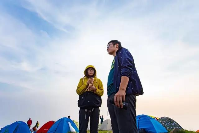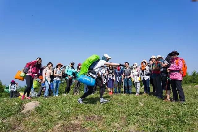 蓝天下,云雾中,青翠的高山草甸,盛放的百花丛中,集体发呆。这次活动是很多小伙伴的重装扎营初体验,自行背负15KG+的重量徒步及爬升,拍下这张图片的摄影师更是背了好几斤重的镜头,这样的美景是否对得起你付出的汗水呢?
