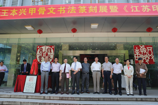 5月18日上午,王本兴校友甲骨文书法篆刻展暨《江苏印人传》首发式在南大鼓楼校区图书馆举行。南大党委副书记朱庆葆,校长助理、艺术学院院长周宪,校友总会、出版社和图书馆等相关部门负责人,原江苏省副省长戴顺智,南京市人大副主任、市总工会主席、南大校友总会常务理事许慧玲,原南京军区副政委兰保军,原江苏省文化厅副厅长、江苏省国画院院长赵绪成,江苏省甲骨文学会副会长、秘书长王道云等领导和同行参加仪式并参观了展览。
