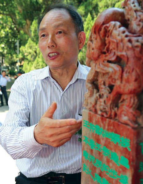 王本兴镌刻的“诚朴雄伟,励学敦行”寿山石校训大印特别引人瞩目。此印高70厘米、底面22×22厘米、重约180斤,印纽:“九龙戏珠”。“珠” 即代表一个小圆球、亦代表一个地球,“九龙”代表莘莘学子,代表炎黄子孙、龙之传人,他们遍布、奋斗在世界各地!印文“诚朴雄伟 励学敦行”八个校训大字,用汉代缪篆文字刻就,边款用隶书镌刻。整个大印显得十分古朴庄重、雄强而又壮观。大印和印拓以及书法作品由王本兴捐赠给母校,以誌庆贺。