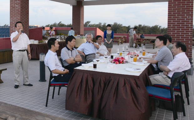 海南校友会为母校访问团举行欢送晚会。图为校党委副书记任利剑(右二)、组织部长王志林(右一)和海南校友会会长吴士存(左三)、副会长朱华友(左二)、曾国华等在晚会上。