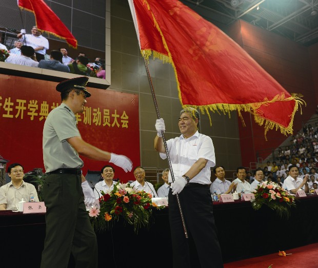 党委副书记任利剑宣读军训旅领导机构之后,党委书记洪银兴给军训旅授军旗。承训部队舟桥旅政委秦新激励同学们在军训中挑战自我、超越自我、完善自我,勤学苦练,勇争第一,全面展现当代青年的精神风貌。