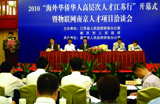 今夏,我校海外校友继续参加与组织“海外华侨华人高层次人才江苏行”活动。图为我校党委任利剑副书记(左一)、江苏省侨办主任钱兴荣校友(左三)等领导和海外校友代表出席2010年海外华侨华人高层次人才江苏行活动开幕仪式。