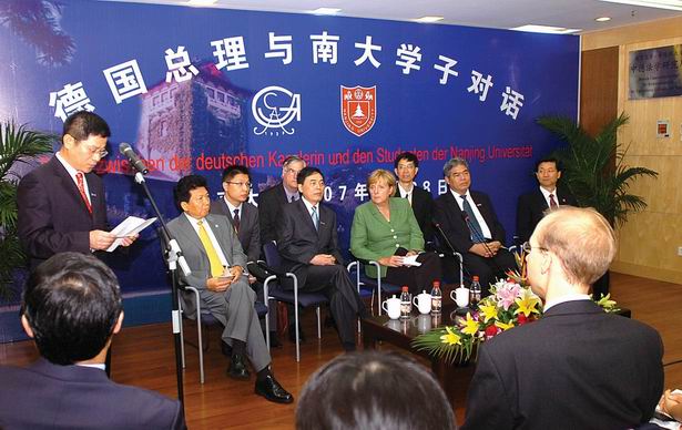 8月28日下午,德国总理默克尔访问我校。江苏省副省长张卫国、校党委书记洪银兴、校长陈骏、副校长张异宾等省、校领导在我校中德法学研究所举行了欢迎仪式。欢迎仪式由副校长张荣主持。陪同默克尔总理访问我校的有德国联邦议院副议长佩特拉·保、驻华大使施明贤等联邦议院议员、政府官员,我国驻德国大使马灿荣以及外交部、公安部和江苏省、南京市有关部门负责人等。