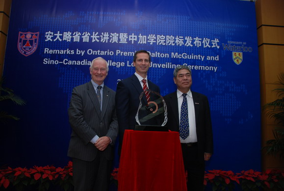 10月31日上午,加拿大安大略省省长多尔顿·麦坚迪先生和滑铁卢大学校长大卫·琼斯顿先生一行访问我校,与洪银兴书记一起为中加学院院标揭牌。