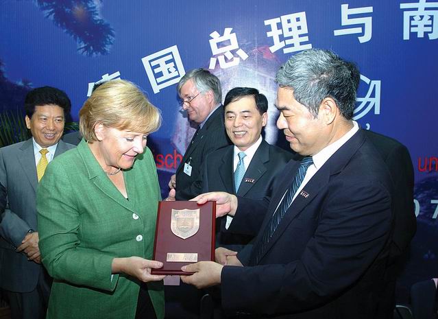 8月28日下午,德国总理默克尔访问我校。江苏省副省长张卫国、校党委书记洪银兴、校长陈骏、副校长张异宾等省、校领导在我校中德法学研究所举行了欢迎仪式。欢迎仪式由副校长张荣主持。陪同默克尔总理访问我校的有德国联邦议院副议长佩特拉·保、驻华大使施明贤等联邦议院议员、政府官员,我国驻德国大使马灿荣以及外交部、公安部和江苏省、南京市有关部门负责人等。