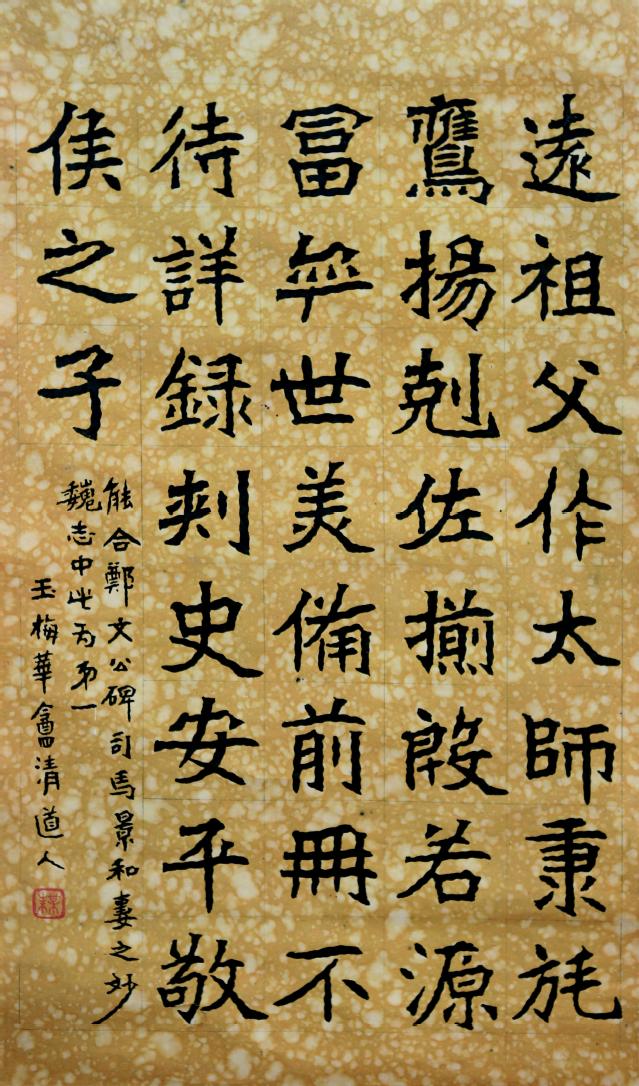 其次是因为他具有深厚的语言文字学修养。李瑞清说:“余书本从篆分入,学书不学篆,犹文家不通经也。故学书必自通篆始,学篆必神游三代,目无二李(谓李斯、李阳冰),乃得佳耳。”(《清道人遗集》158页《玉梅花庵书断》)他从小就开始学习语言学知识,尝云:“瑞清幼习训诂,钻研六书,考览鼎彝。”(《清道人遗集》34页《报陶心云书》)蒋国榜也称其“就傅读,喜诵秦汉文,又潜治《说文》、《三礼》、《公羊》何氏学,塾师强习功令文,不顾也。”(《清道人遗集》97页《临川李文洁公传略》)深厚的语言文字学知识不仅为他学习书法奠定了坚实的基础,而且也增加了他书法作品的学术含量。如他在《跋汉五斗鍪拓本》中,就引用了《说文》、《广雅》、《急就篇》、《汉书》颜师古注、《考工记》及注、《钟鼎款识》、《三礼图》对“鍪”的音义与形状作了详细考证。下面再举一例,其《鲁孝王石刻跋》云:“年本从禾,上作垂笔,乃由篆初入隶形耳。”(《清道人遗集》140页)此跋使我们充分地认识到文字学知识对于书法是多么的重要。